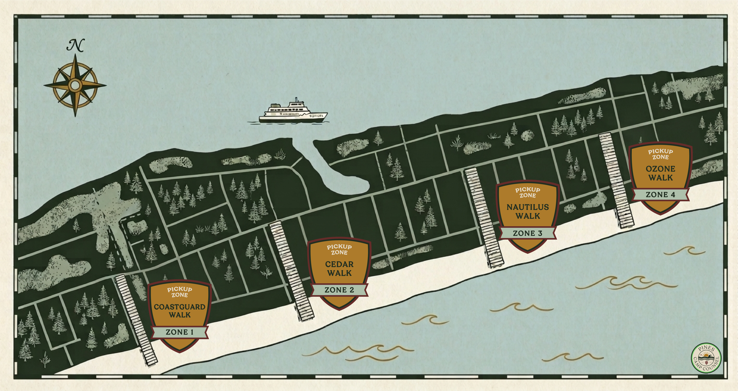 You'll choose your preferred zone and arrival time via email about 48 hours before your reservation — or anytime before your beach day at pinescampcounsel.com/manage. You can also view the zone map here.